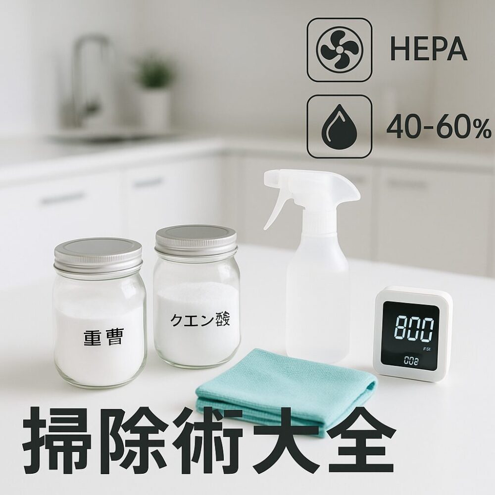 - 空気と衛生管理: 室内空気を綺麗に保つには、換気を習慣づけCO₂ 1000ppm以下を目指すこと、空気清浄機(HEPAフィルター搭載)を上手に使うことが有効です。湿度は50%前後に維持し、ダニ・カビの温床を防ぎましょう。掃除機の20秒ルールや寝具洗濯の頻度もご紹介しました。
