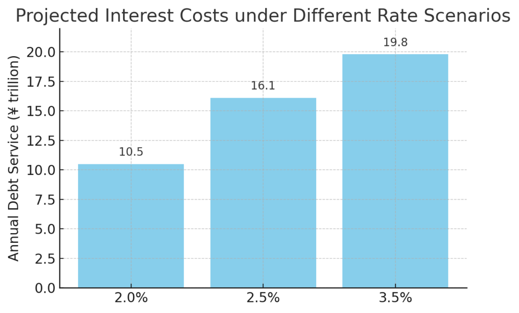 具体的には、長期金利2.0%を基準ケース(財務省想定)とした場合、利払い費は年10.5兆円程度と見込まれます。これが2.5%へ上昇すると約16.1兆円に増加し、追加利払いは約+5.6兆円に達します。さらに3.5%まで上昇すると、基準ケース比で約+9.3兆円(=5.6兆+3.7兆)増の19.8兆円程度に膨らみます。この+3.7兆円という数字が「金利1%上昇で利払い費+3.7兆円」の試算値に相当します。これほどの利払い費増は、例えば同程度の増税(消費税換算で2%強の引上げに相当)をしても相殺しきれない規模であり、金利上昇が財政に与えるインパクトの大きさを物語ります。