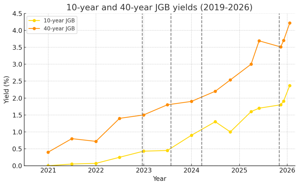 【図表B:日本国債(10年債・40年債)利回りの推移(2019〜2026年)】 出所:財務省「国債金利情報」データ等より作成。灰色の破線は主要な政策変更時点を示す(2022年12月YCC上限0.5%へ拡大、2023年7月YCC運用緩和、2024年3月マイナス金利解除、2025年末財政拡張への懸念)